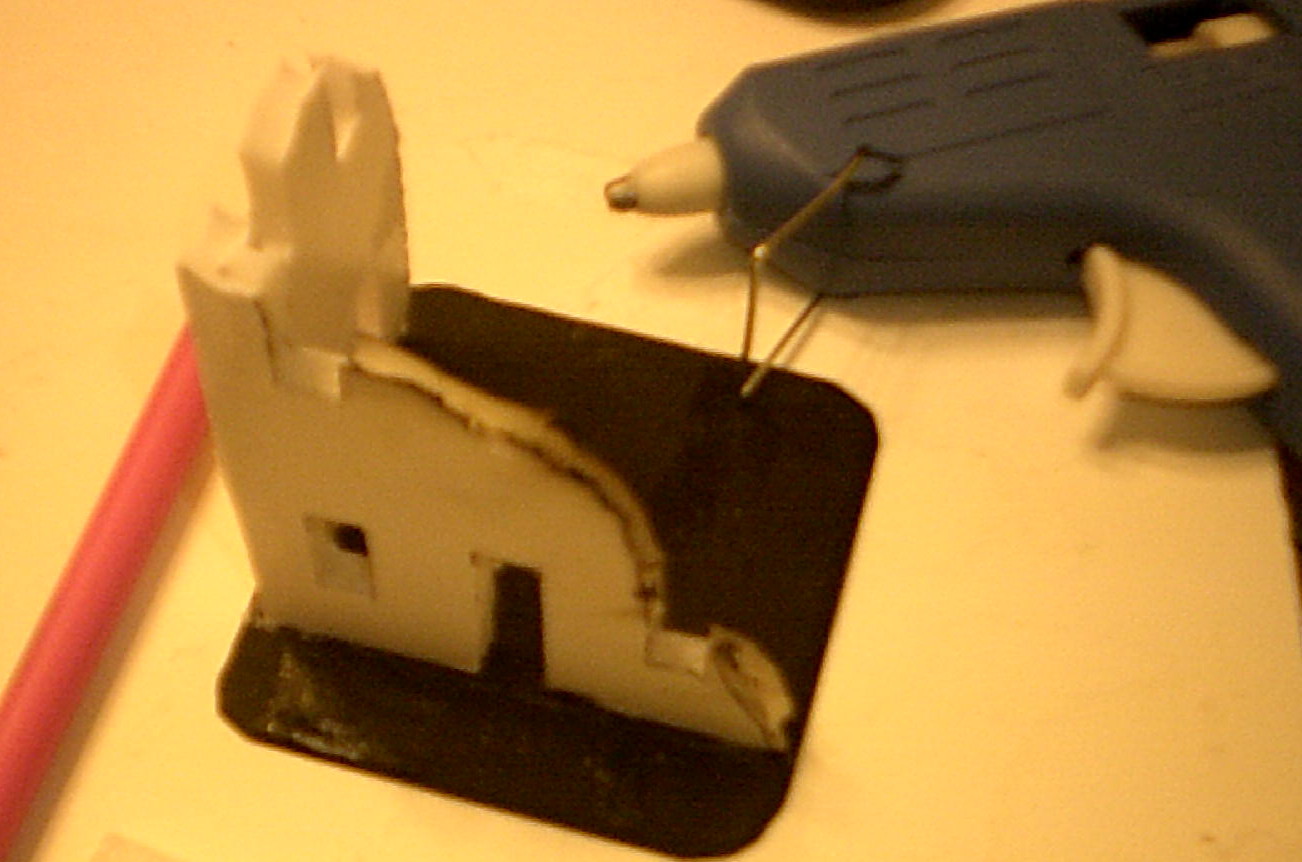 Here I have used a low coast hot melt glue gun to lay down a bead of glue to secure the wall sections to the plywood base.