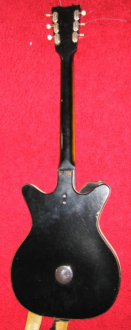 Zorko's Guitars A Danelectro Deluxe with Single Pickup, Tone Selector Switch and Tremolo This guitar was purchased from a music shop for the sum of $35.00 back in the 1970s. This vintage Danelectro has a pile of interesting features including the classic semi-hollow construction of soft-pine with Masonite top, back and pick guard, Lipstick pickup, dual steel "I" beam non-adjustable truss rods, tone selector switch, wide (duck foot) head stock, the neck is quite wide and does not tapper either in width or thickness and internal spring tremolo as see by the large chrome cover on the back (the tremolo arm, that attached to either of the two studs on the bridge plate, broke back in the 1980s). I did have to modify this baby to get it to be playable. Most notably, replacement of the original tuning machines with Kulson's. The stock machine were seized with age even back in the 1970s. The replacement was tricky in that the bushings had to be enlarger and the thickness of the head stock it greater then standard. But the enclosed replacement tuning machine should last a long time into the future.