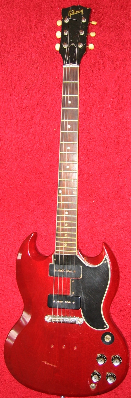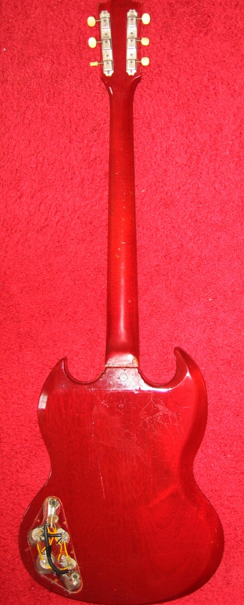 Zorko's Guitars A Gibson SG I do not recall the details of getting this guitar. It had a broken neck and pickups, so it may have been given to me or part of a trade. Originally a fixed neck, it had been broken right at the heal. I recall at least two re-gluings trying to stabilize it. From these photos it looks as if it might have had a more recent work. Also I hand rewound the pickups several times. The original bobbins were busted up pretty badly. I think the spring and mounting hardware for the tremolo may still be around, but no handle or tail piece. I do not recall if the combo bridge tail peice was a replacement or not. It might have been used as the bridge for the original tremolo setup.